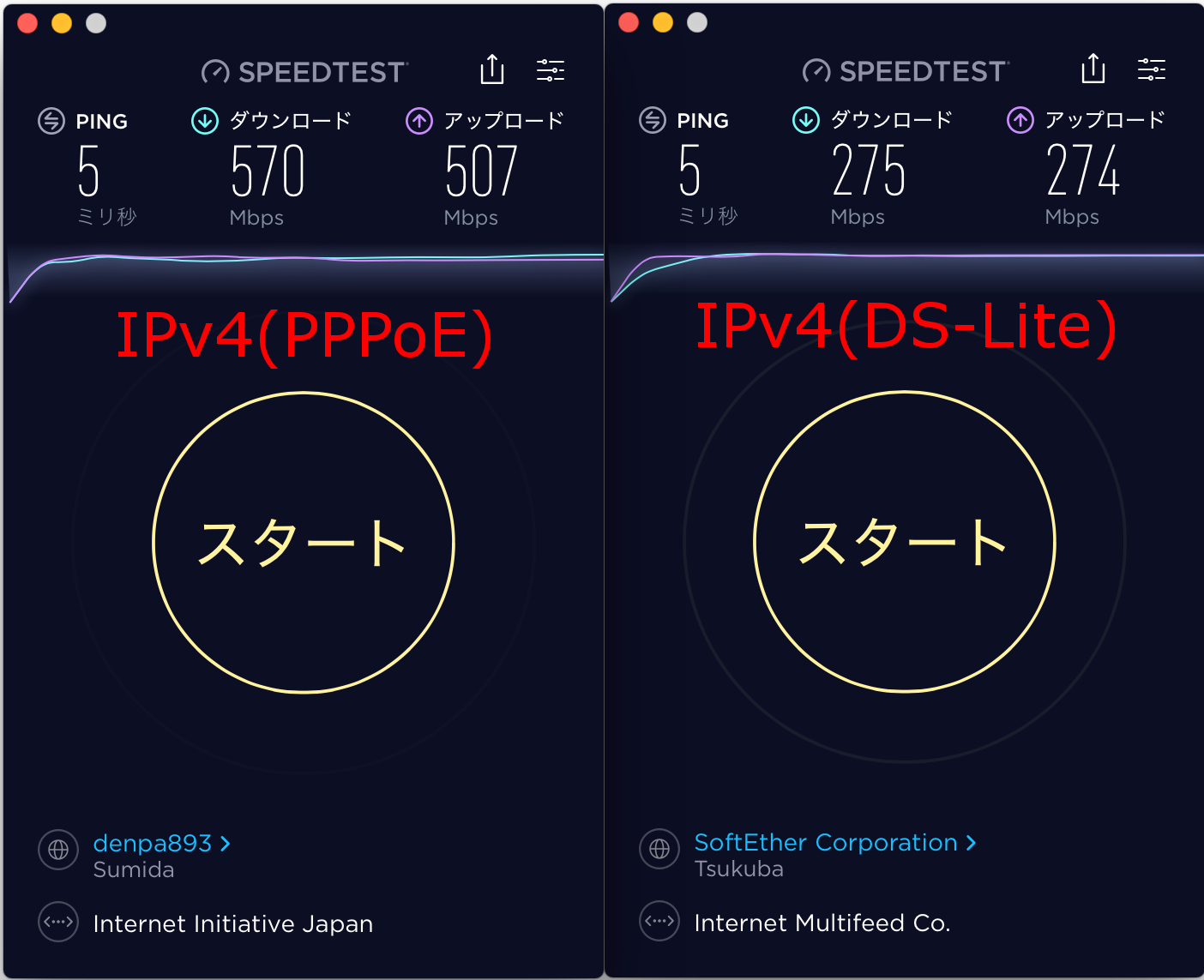 土曜日朝4時台 IPv4(PPPoE):下り570Mbps-5ms、IPv4(DS-Lite):下り275Mbps-5ms